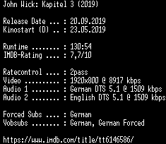 | FiLENAME: | John.Wick.Kapitel.3.2019.German.DTS.DL.1080p.BluRay.x264-COiNCiDENCE.mkv |