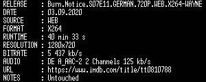 | FiLENAME: | Burn.Notice.S07E11.GERMAN.720P.WEB.X264-WAYNE.mkv |