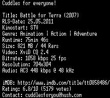 | FiLENAME: | Battle.For.Terra.German.2007.AC3.DVDRip.XviD-CUDDLES.avi |
