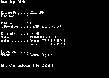 | FiLENAME: | Draft.Day.2014.German.DL.1080p.BluRay.x264-EXQUiSiTE.mkv |