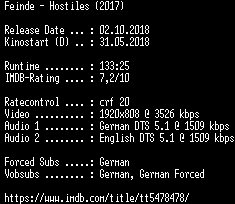 | FiLENAME: | Feinde.Hostiles.2017.German.DTS.DL.1080p.BluRay.x264-COiNCiDENCE.mkv |