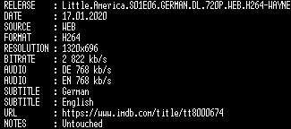 | FiLENAME: | Little.America.S01E06.GERMAN.DL.720P.WEB.H264-WAYNE.mkv |