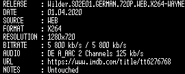 | FiLENAME: | Wilder.S02E01.GERMAN.720P.WEB.X264-WAYNE.mkv |