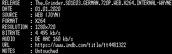 | FiLENAME: | The.Grinder.S01E03.GERMAN.720P.WEB.X264.INTERNAL-WAYNE.mkv |