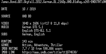 | FiLENAME: | James.Bond.007.Skyfall.2012.German.DL.2160p.UHD.BluRay.x265-ENDSTATiON.mkv |