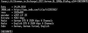 | FiLENAME: | Jumanji.Willkommen.im.Dschungel.2017.German.DL.1080p.BluRay.x264-CHECKMATE.mkv |
