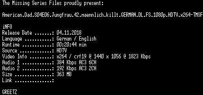 | FiLENAME: | American.Dad.S04E06.Jungfrau.42.maennlich.killt.GERMAN.DL.FS.1080p.HDTV.x264-TMSF.mkv |