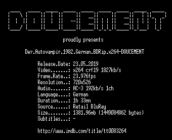 | FiLENAME: | Der.Autovampir.1982.German.BDRip.x264-DOUCEMENT.mkv |
