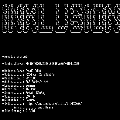 | FiLENAME: | Tsotsi.German.REMASTERED.2005.BDRiP.x264-iNKLUSiON.mkv |