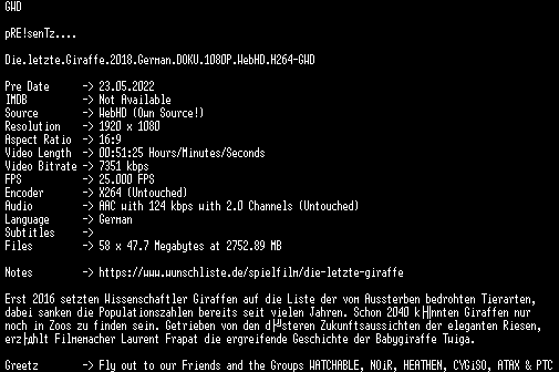 | FiLENAME: | Die.letzte.Giraffe.2018.German.DOKU.1080P.WebHD.H264-GWD.mkv |