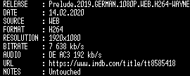 | FiLENAME: | Prelude.2019.GERMAN.1080P.WEB.H264-WAYNE.mkv |