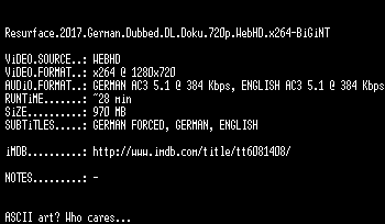 | FiLENAME: | Resurface.2017.German.Dubbed.DL.Doku.720p.WebHD.x264-BiGiNT.mkv |
