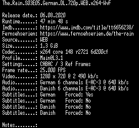 | FiLENAME: | The.Rain.S03E05.German.DL.720p.WEB.x264-WvF.mkv |