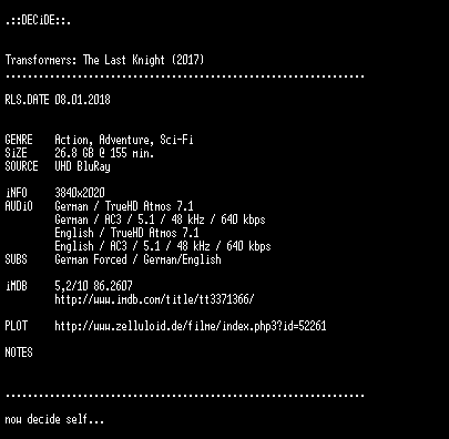 | FiLENAME: | Transformers.The.Last.Knight.2017.GERMAN.DL.2160p.UHD.BluRay.x265-DECiDE.mkv |