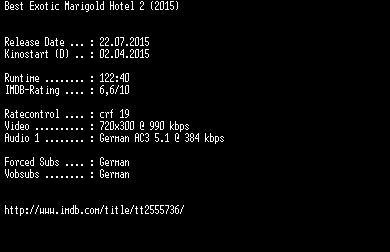 | FiLENAME: | Best.Exotic.Marigold.Hotel.2.German.2015.AC3.BDRiP.x264-EXQUiSiTE.mkv |
