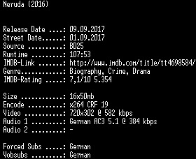 | FiLENAME: | Neruda.German.2016.AC3.BDRip.x264-SPiCY.mkv |