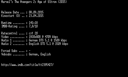 | FiLENAME: | Marvels.The.Avengers.2.Age.of.Ultron.2015.German.DTS.DL.1080p.BluRay.x264-EXQUiSiTE.mkv |