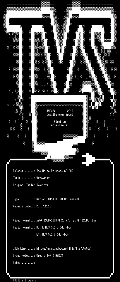 | FiLENAME: | The.White.Princess.S01E05.Verraeter.GERMAN.DL.1080p.WebHD.x264-TVS.mkv |