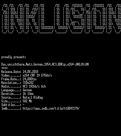 | FiLENAME: | Das.unsichtbare.Netz.German.1954.AC3.BDRip.x264-iNKLUSiON.mkv |