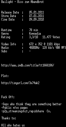 | FiLENAME: | Beilight.Biss.zum.Abendbrot.Kinofassung.German.DVDRip.XviD-DiSTRiCT.avi |