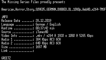 | FiLENAME: | American.Horror.Story.S09E05.GERMAN.DUBBED.DL.1080p.WebHD.x264-TMSF.mkv |