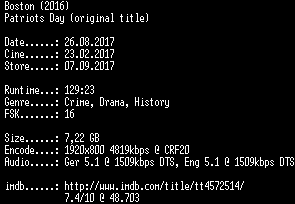 | FiLENAME: | Boston.2016.German.DL.DTS.1080p.BluRay.x264-CiNEViSiON.mkv |