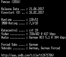 | FiLENAME: | Fences.German.2016.AC3.BDRip.x264-COiNCiDENCE.mkv |