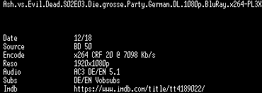 | FiLENAME: | Ash.vs.Evil.Dead.S02E03.Die.grosse.Party.German.DL.1080p.BluRay.x264-PL3X.mkv |