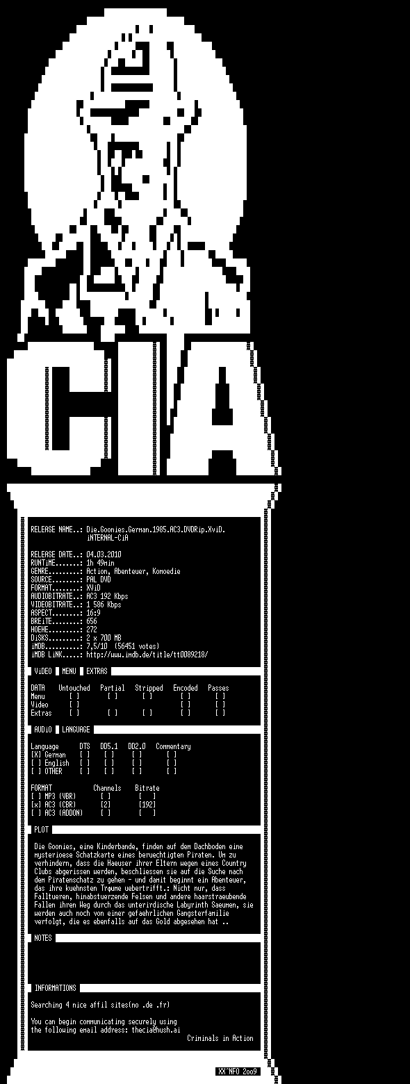 | FiLENAME: | Die.Goonies.German.1985.AC3.DVDRip.XviD.iNTERNAL-CiA.CD1.avi |
