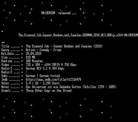 | FiLENAME: | The.Diamond.Job.Gauner.Bomben.und.Juwelen.GERMAN.2018.AC3.BDRip.x264-UNiVERSUM.mkv |