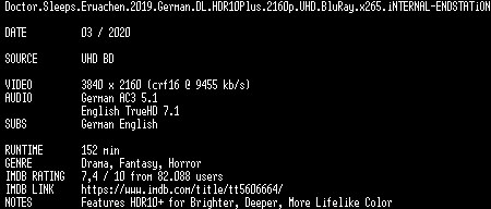 | FiLENAME: | Doctor.Sleeps.Erwachen.2019.German.DL.HDR10Plus.2160p.UHD.BluRay.x265.iNTERNAL-ENDSTATiON.mkv |