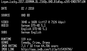 | FiLENAME: | Logan.Lucky.2017.GERMAN.DL.2160p.UHD.BluRay.x265-ENDSTATiON.mkv |