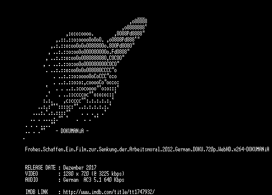 | FiLENAME: | Frohes.Schaffen.Ein.Film.zur.Senkung.der.Arbeitsmoral.2012.German.DOKU.720p.WebHD.x264-DOKUMANiA.mkv |