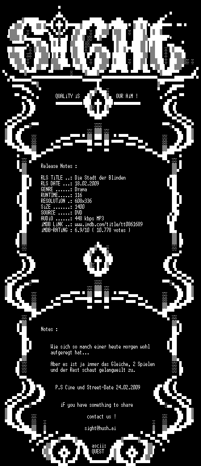 | FiLENAME: | Die.Stadt.der.Blinden.German.2008.AC3.DVDRip.XviD-SiGHT.CD2.avi |