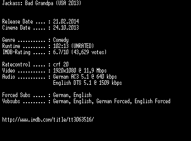 | FiLENAME: | Jackass.Bad.Grandpa.UNRATED.German.DL.1080p.BluRay.x264-EXQUiSiTE.mkv |