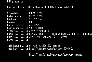 | FiLENAME: | Game.of.Thrones.S08E04.German.DL.1080p.BluRay.x264-RWP.mkv |