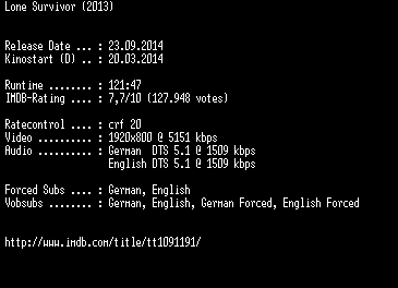 | FiLENAME: | Lone.Survivor.German.DL.1080p.BluRay.x264-EXQUiSiTE.mkv |