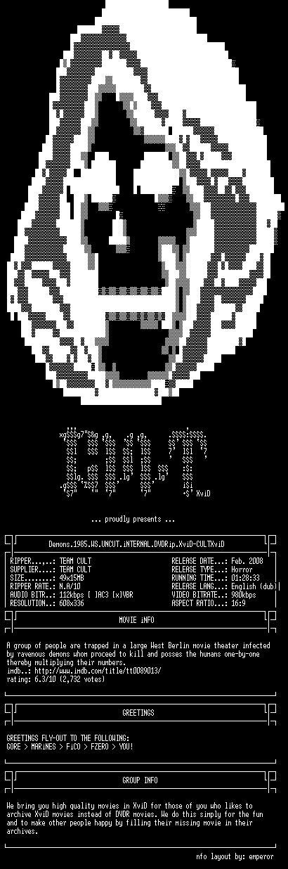 | FiLENAME: | Demons.1985.WS.UNCUT.iNTERNAL.DVDRip.XviD-CULTXviD.avi |