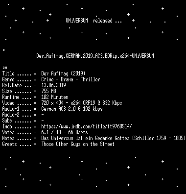 | FiLENAME: | Der.Auftrag.GERMAN.2019.AC3.BDRip.x264-UNiVERSUM.mkv |
