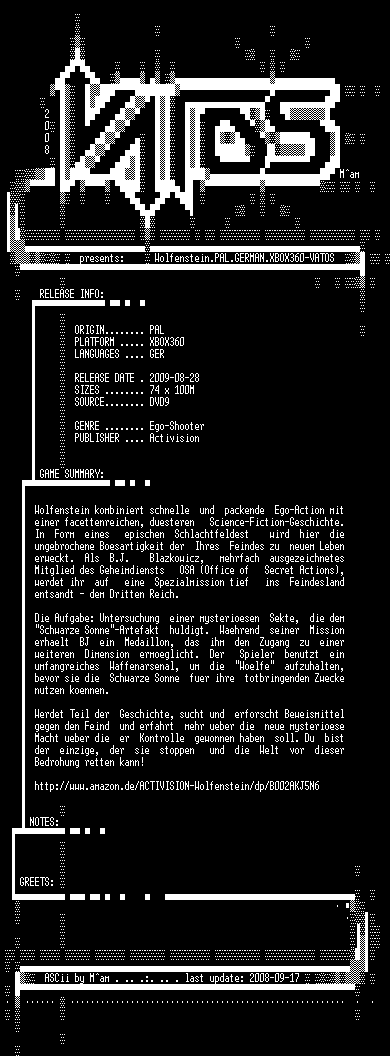 | FiLENAME: | Wolfenstein.PAL.GERMAN.XBOX360-VATOS.iso |