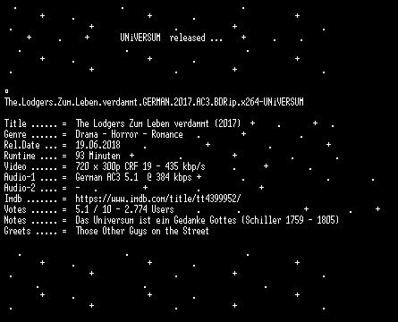 | FiLENAME: | The.Lodgers.Zum.Leben.verdammt.GERMAN.2017.AC3.BDRip.x264-UNiVERSUM.mkv |