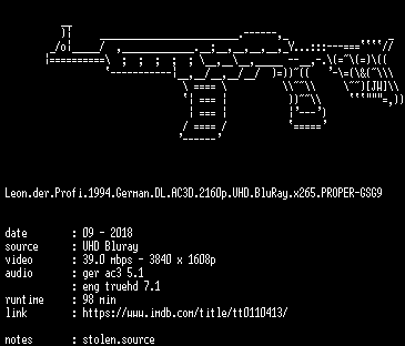 | FiLENAME: | Leon.der.Profi.1994.German.DL.AC3D.2160p.UHD.BluRay.x265.PROPER-GSG9.mkv |