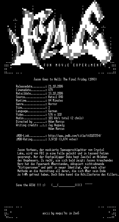 | FiLENAME: | Jason.goes.to.Hell.Die.Endabrechnung.German.1993.UNRATED.DVDRiP.XviD-FmE.avi |