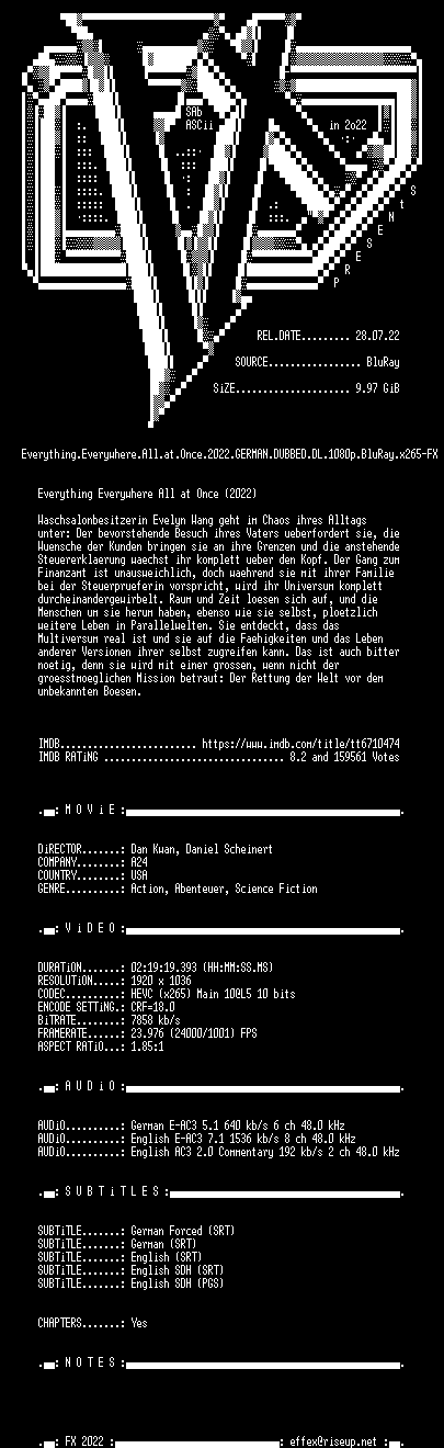 | FiLENAME: | Everything.Everywhere.All.at.Once.2022.GERMAN.DUBBED.DL.1080p.BluRay.x265-FX.mkv |