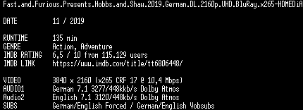 | FiLENAME: | Fast.and.Furious.Presents.Hobbs.and.Shaw.2019.German.DL.2160p.UHD.BluRay.x265-HDMEDiA.mkv |