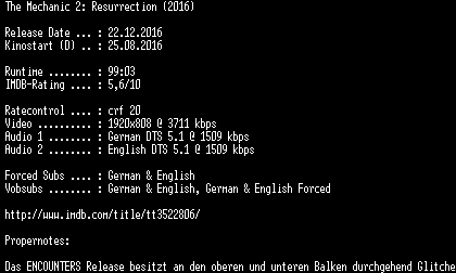 | FiLENAME: | The.Mechanic.2.Resurrection.2016.German.DTS.DL.1080p.BluRay.x264.PROPER-COiNCiDENCE.mkv |
