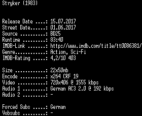 | FiLENAME: | Stryker.German.REMASTERED.1983.AC3.BDRip.x264-SPiCY.mkv |