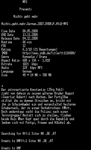 | FiLENAME: | Nichts geht mehr (2007) [GER WS DVD].avi |
