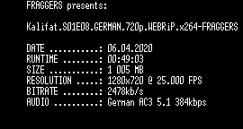 | FiLENAME: | Kalifat.S01E08.GERMAN.720p.WEBRiP.x264-FRAGGERS.mkv |