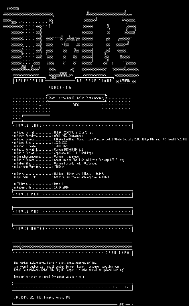 | FiLENAME: | Ghost.in.the.Shell.Solid.State.Society.GERMAN.5.1.DUBBED.DL.DTSMA.ANiME.BDRiP.1080p.WS.x264-TvR.mkv |